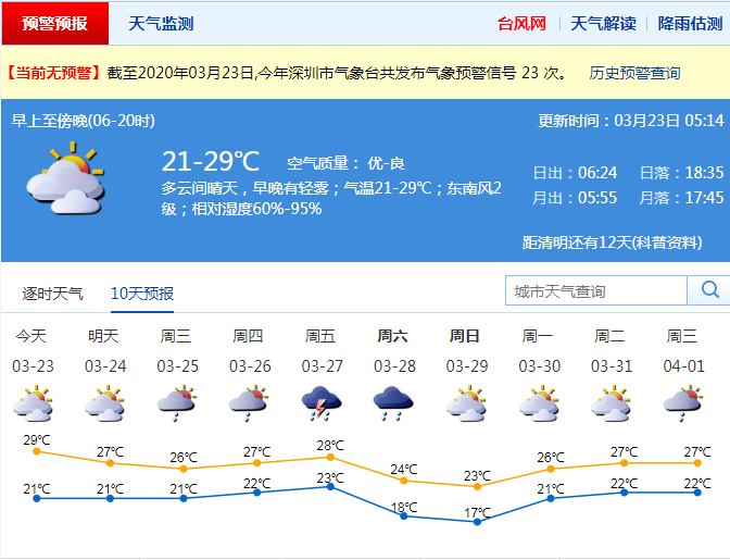 見圳客戶端·深圳新聞網2020年3月22日訊 深圳今天多云間晴天,早晚有輕霧;氣溫21-29℃;東南風2級;相對濕度60%-95%。