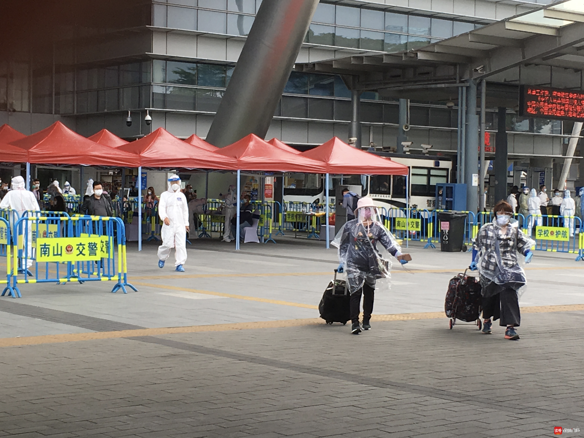 在入境廳東側(cè),停有兩排大巴,大巴前均放有該車通往目的地的指示牌。記者看到,持護(hù)照的旅客在入境大廳門口接受分類指引,掃碼后填寫前往城市,領(lǐng)取乘車憑證,穿白色防護(hù)服的工作人員還會(huì)帶引旅客到指定大巴,由大巴免費(fèi)送往目的地或酒店醫(yī)學(xué)觀察點(diǎn)?!耙粋€(gè)人上車就可以走,不用怎么等。”龍崗車隊(duì)師傅告訴記者,旅客上車后會(huì)及時(shí)發(fā)車,將他們帶離口岸。