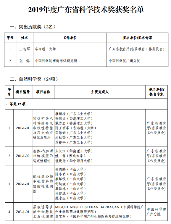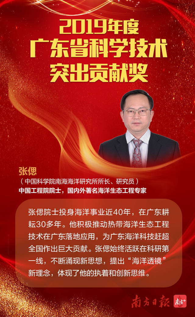 其中,2019年度廣東省科學(xué)技術(shù)突出貢獻獎的獲獎?wù)叻謩e為:中國工程院院士、亞太材料科學(xué)院院士、華南理工大學(xué)教授王迎軍;中國工程院院士,國內(nèi)外著名海洋生態(tài)工程專家,中科院南海海洋研究所所長、研究員張偲。