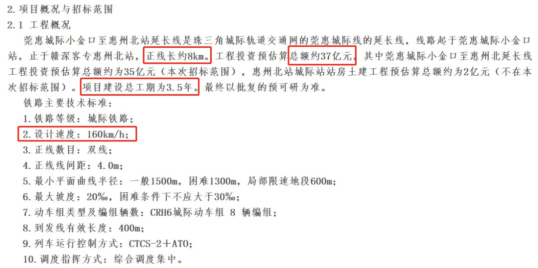 此間公示的莞惠城際小金口至惠州北站延長線,則是珠三角城際軌道交通網(wǎng)的莞惠城際線的延長線,線路起于莞惠城際小金口站,止于贛深客?;葜荼闭?,正線長約8km,設(shè)計速度為160km/h。工程投資預(yù)估算總額約37億元,其中莞惠城際小金口至惠州北延長線工程投資預(yù)估算總額約為35億元(本次招標(biāo)范圍),惠州北站城際站站房土建工程預(yù)估算總額約為2億元(不在本次招標(biāo)范圍)。