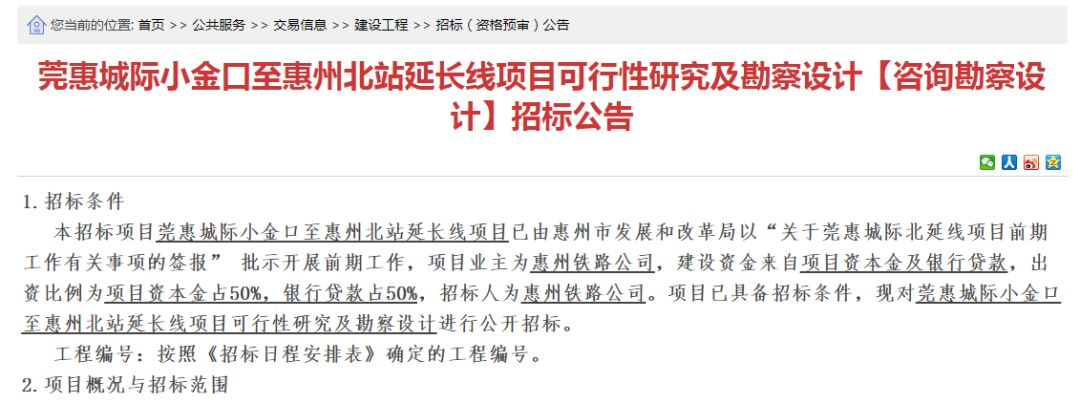 公告顯示,莞惠城際小金口至惠州北站延長線正進行可行性研究及勘察設(shè)計招標(biāo),招標(biāo)金額為7452.47萬元(含稅價)。
