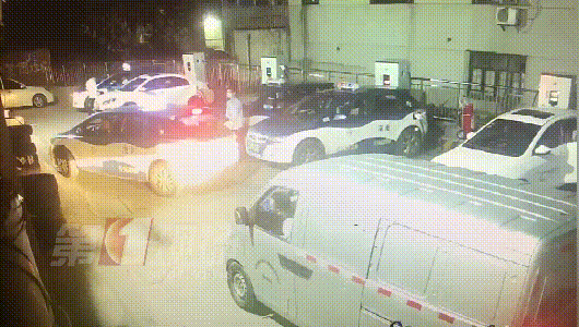 監(jiān)控畫面顯示,25日晚上23點左右,一輛出租車和一輛面包車先后到達龍崗大道木棉灣路段的一個充電站。出租車司機先找到了一個位置,準備倒入充電時,后面的面包車突然往前開,兩名司機因為停車位的問題發(fā)生爭執(zhí)。隨后,出租車司機下車理論,動手推搡了面包車司機一下。