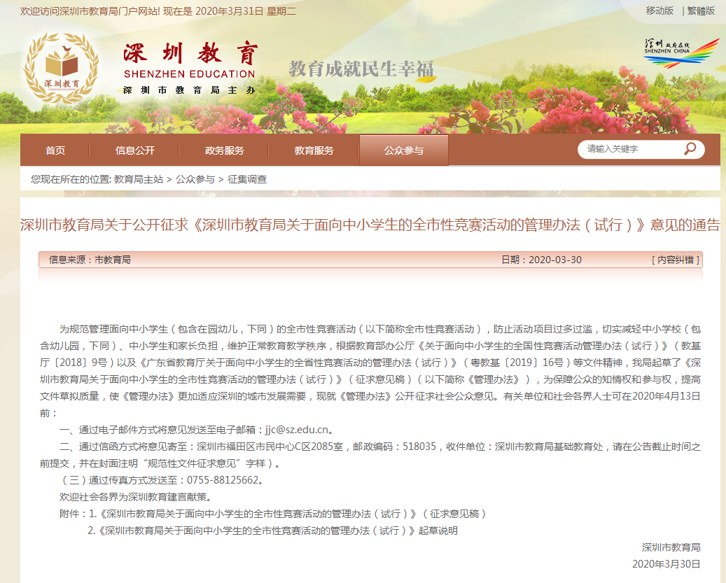 深圳特區(qū)報(bào)2020年3月30日訊 3月30日, 深圳市教育局發(fā)布《關(guān)于面向中小學(xué)生的全市性競(jìng)賽活動(dòng)的管理辦法(試行)》(征求意見稿)(以下簡(jiǎn)稱《辦法》),并面向社會(huì)征求意見?!掇k法》指出,要從嚴(yán)控制、嚴(yán)格管理全市性競(jìng)賽活動(dòng),原則上不舉辦面向義務(wù)教育階段的全市性競(jìng)賽活動(dòng)。