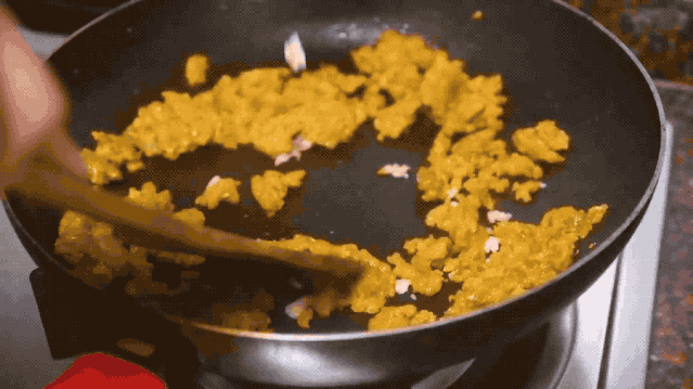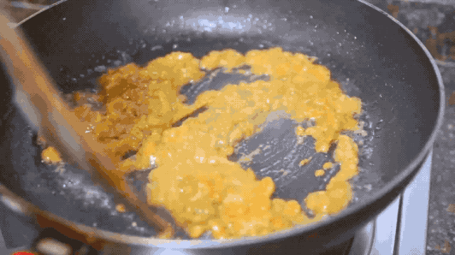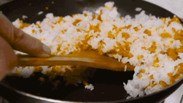 油鍋燒熱,不斷翻炒海膽,直到把海膽的水分炒干,只有動(dòng)作快和把握好火候,才能保留海膽的鮮度。海膽炒得呈粒狀就可加入蒜蓉,這樣可以更好地刺激海膽香味。把米飯和海膽融合一起翻炒,使每一粒米飯都充分接觸油和熱量,這樣的炒飯才會(huì)松軟可口。最后加一點(diǎn)醬油,灑上一把蔥花銷魂的海膽炒飯就出爐啦。