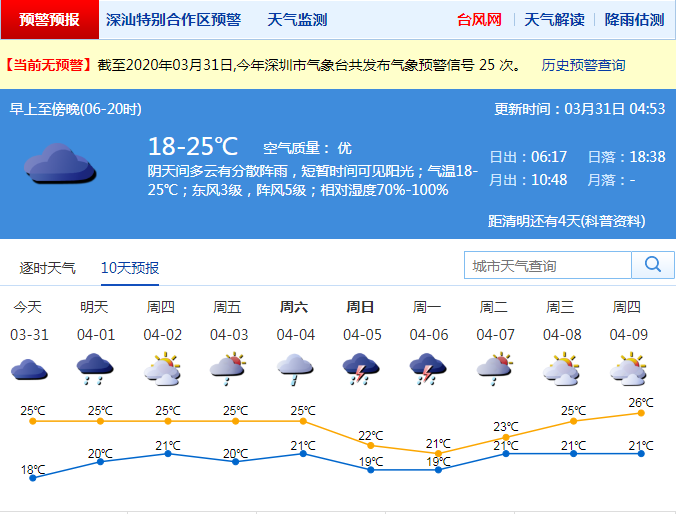 見(jiàn)圳客戶端·深圳新聞網(wǎng)2020年3月31日訊 31日陰天間多云,有零星小雨和輕霧,氣溫19-25℃;1日至4月3日多云到陰天,部分時(shí)間有分散小雨和輕霧;4-6日有一次明顯降雨過(guò)程。