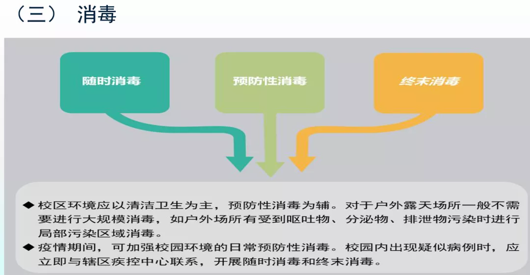 二是實(shí)施校園封閉式管理。做好校園衛(wèi)生整治、“四害”消殺和重點(diǎn)場(chǎng)所的預(yù)防性消毒。設(shè)置相對(duì)獨(dú)立的健康觀察區(qū)(室)、設(shè)置洗手設(shè)施、儲(chǔ)備足夠的防護(hù)用品等措施。