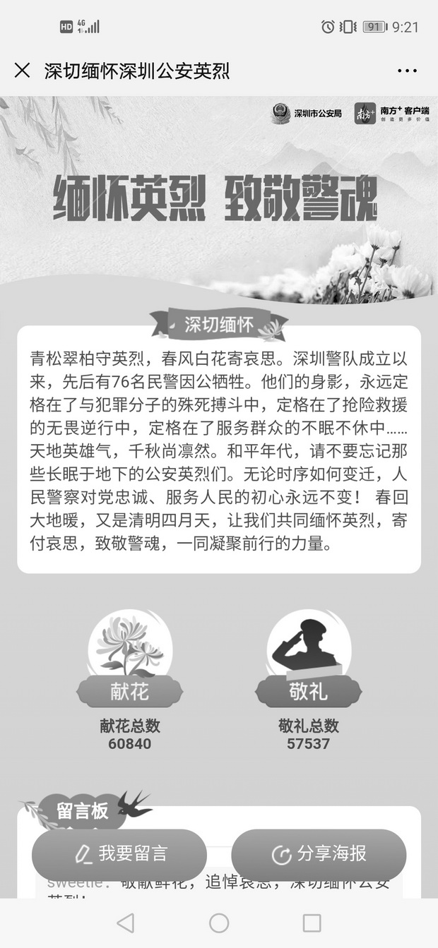 見圳客戶端、深圳新聞網2020年4月4日訊(見圳客戶端、深圳新聞網記者 張喆 通訊員 張奎)清明憶英烈,哀思祭忠魂。4月3日,在清明節(jié)來臨之際,為緬懷公安英烈、致敬忠誠警魂,深圳市公安局以“網上祭掃”的形式,在網絡上開展公安英烈緬懷活動。