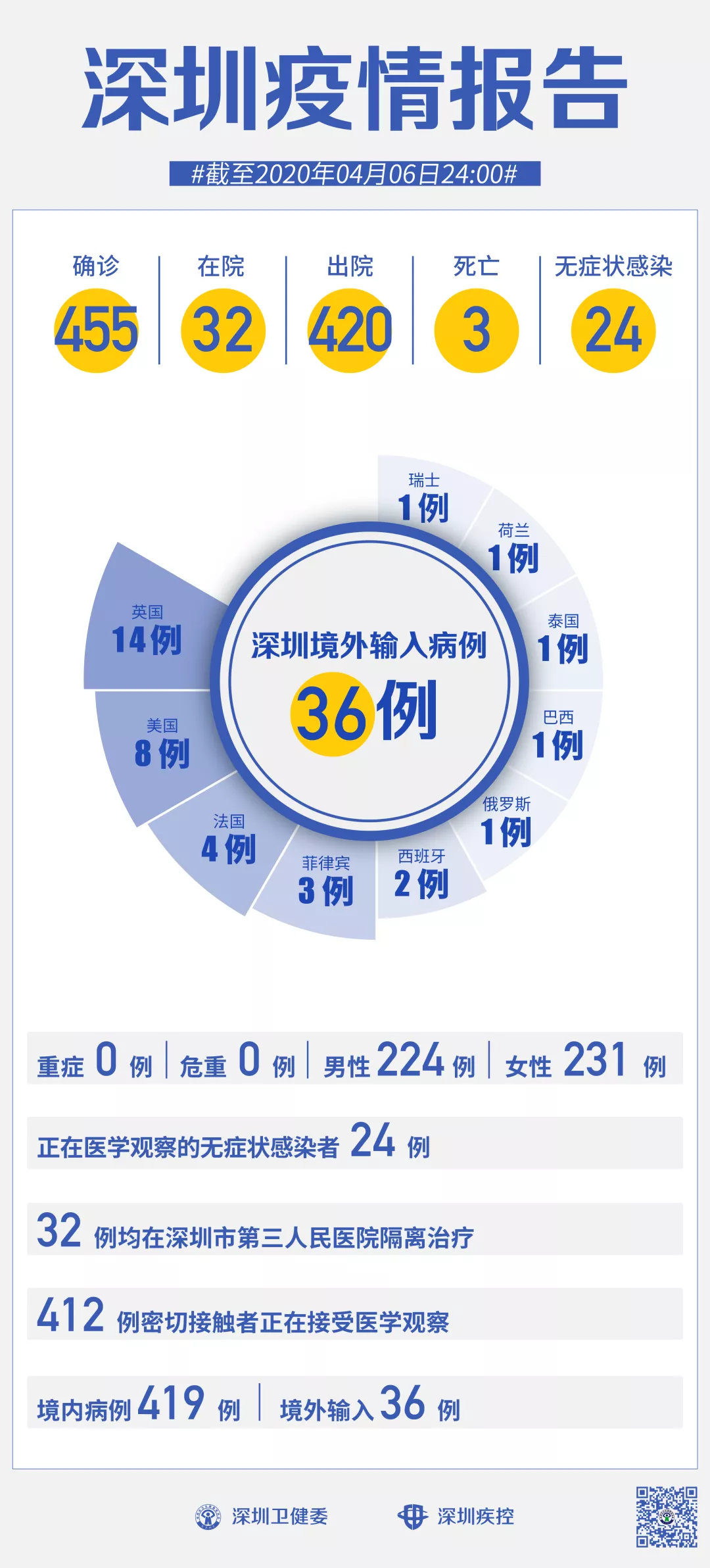 截至4月6日24時,深圳累計(jì)報告新冠肺炎病例455例。4月6日當(dāng)天新增無癥狀感染者1例。