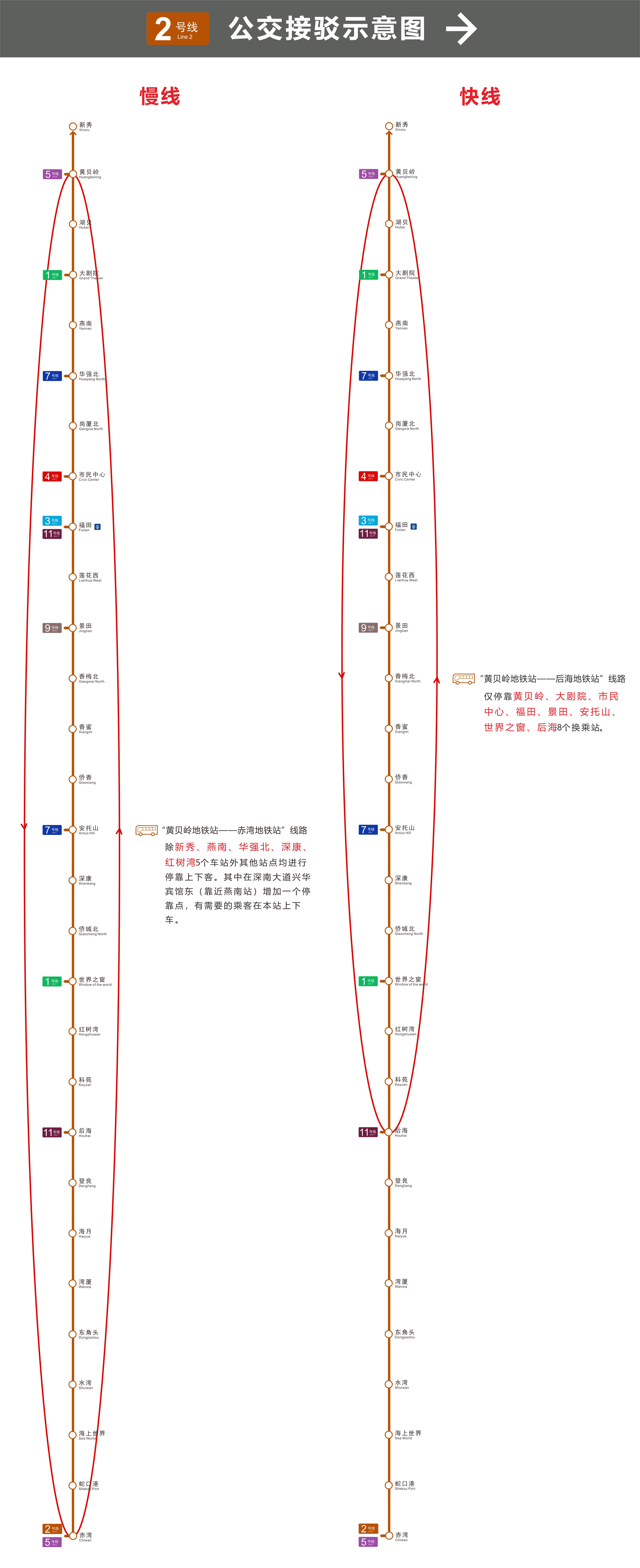 為了方便期間市民乘客的出行,屆時將組織循環(huán)開行2號線的兩條公交接駁線路。1、公交接駁慢線:“黃貝嶺站—赤灣站”。除新秀、燕南、華強北、深康、紅樹灣5個站點不??恐猓溆喔髡揪?可舷驴?。2、公交接駁快線:“黃貝嶺站—后海站”。僅??奎S貝嶺、大劇院、市民中心、福田、景田、安托山、世界之窗、后海共8個換乘站。