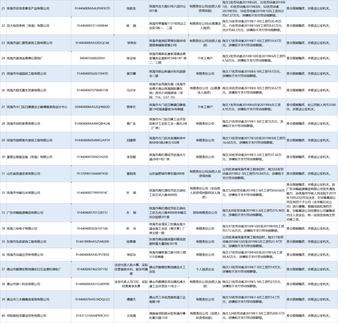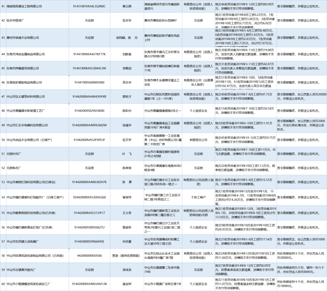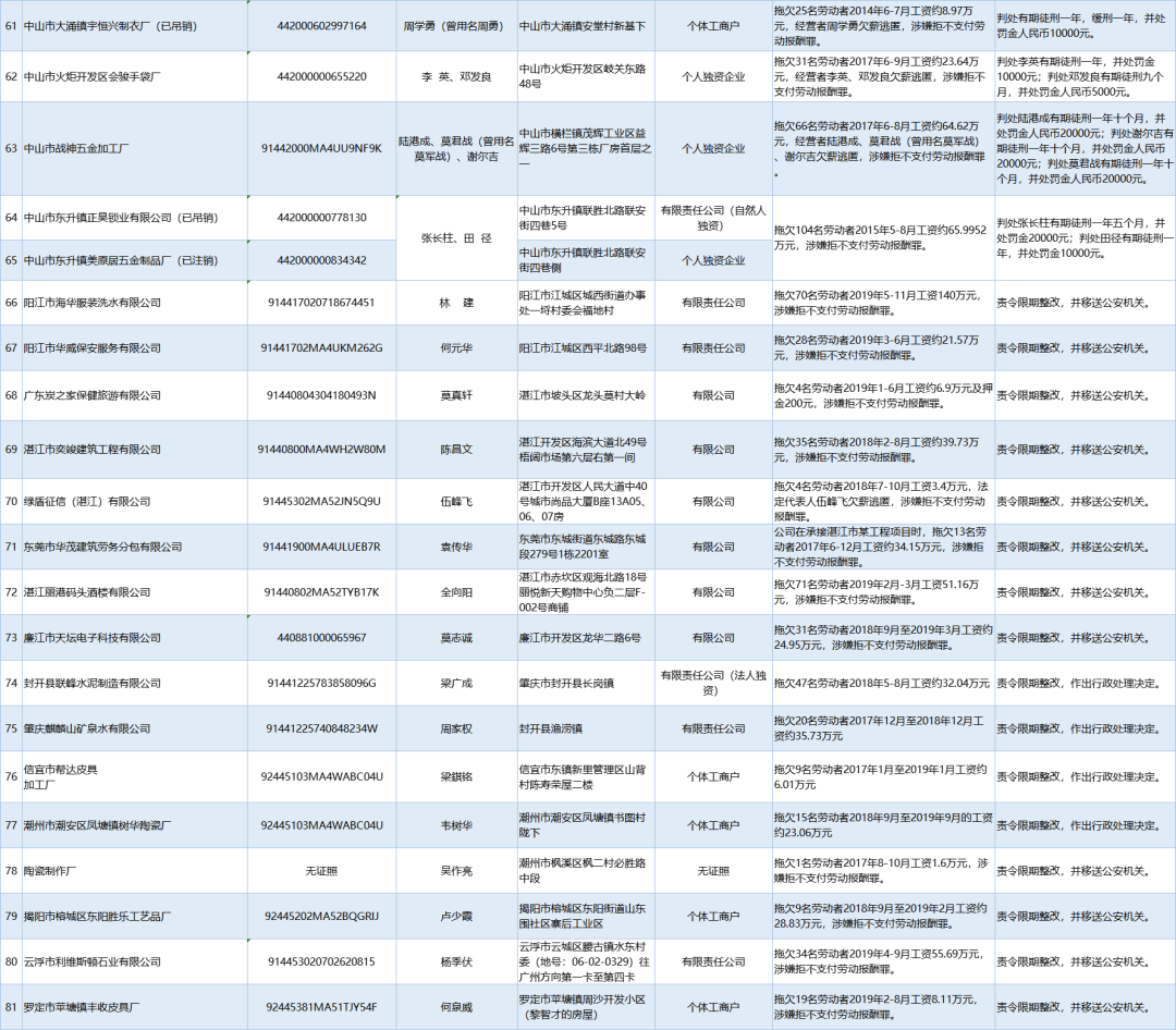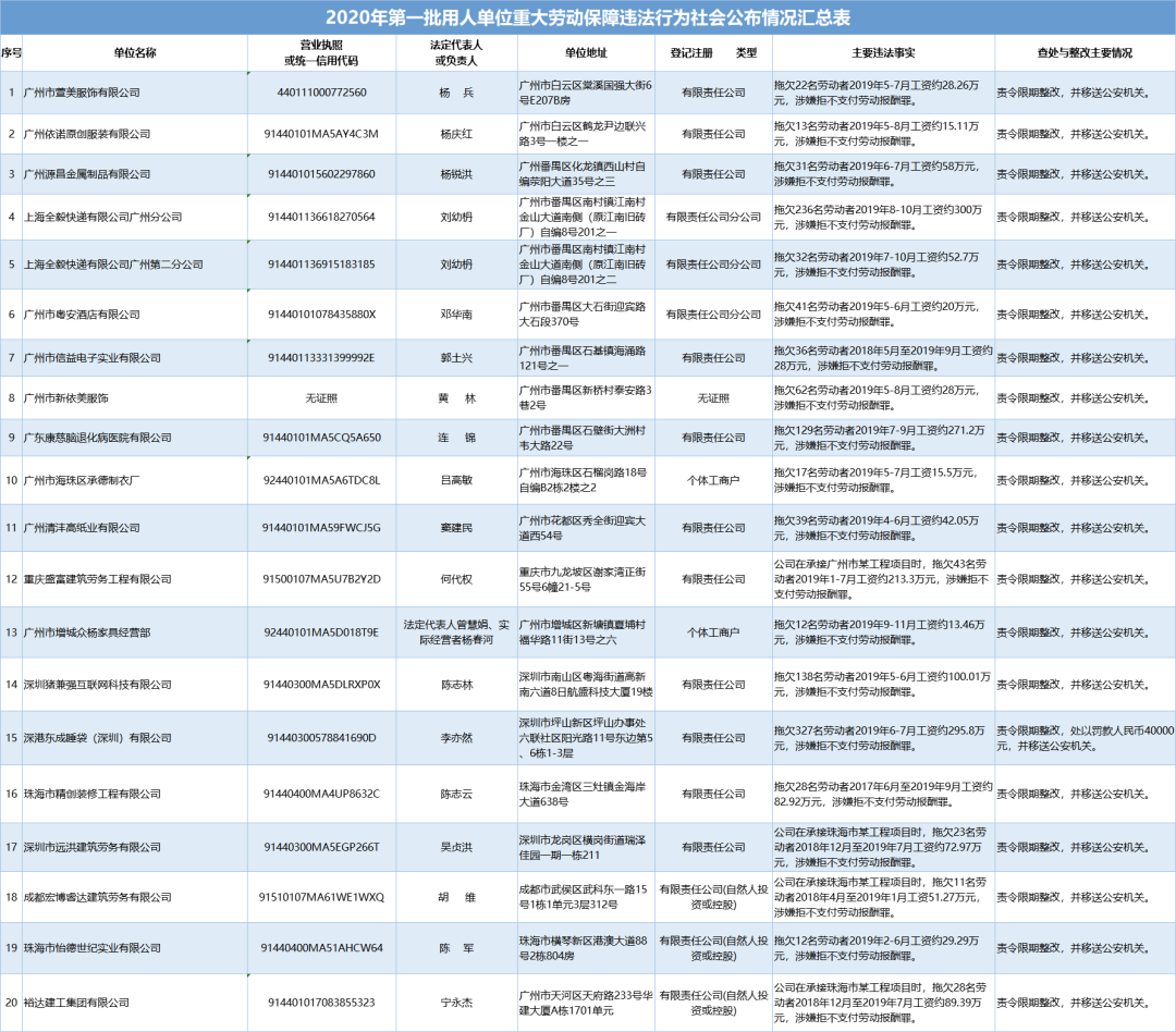 為加強對違法用人單位的社會監(jiān)督,強化誠信體系建設(shè),加大威懾力,依據(jù)《廣東省用人單位重大勞動保障違法行為社會公布暫行規(guī)定》,省人社廳公布2020年第一批重大違法案件,涉及81家企業(yè),其中深圳豬兼強互聯(lián)網(wǎng)科技有限公司拖欠138名勞動者2019年5-6月工資約100.01萬元,涉嫌拒不支付勞動報酬罪,被責(zé)令限期整改,并移送公安機關(guān)。深港東成睡袋(深圳)有限公司拖欠327名勞動者2019年6-7月工資約295.8萬元,涉嫌拒不支付勞動報酬罪,被責(zé)令限期整改,處以罰款人民幣4萬元,并移送公安機關(guān)。
