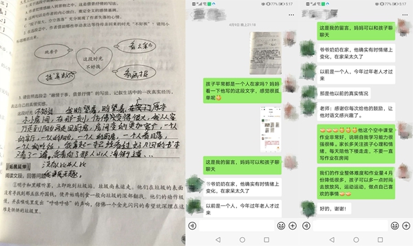 疫情來的迅猛又猝不及防,老師們一方面要完成教學(xué)任務(wù)、引導(dǎo)學(xué)生做好防疫,一方面要時刻關(guān)注學(xué)生的心理健康。學(xué)生們被迫在家度過了一個史上最長的寒假,對于處在叛逆期的孩子們來說,難免會與家人出現(xiàn)一些矛盾,在課堂之外,老師們還需要擔(dān)任“心理調(diào)節(jié)師”的角色。一次,周老師班上有個同學(xué)因為上網(wǎng)課的事情與父母鬧了矛盾,一氣之下跑到奶奶家,周老師得知了這件事情,第一時間聯(lián)系上學(xué)生,通過鼓勵、引導(dǎo),讓學(xué)生認識到自己的錯誤,與父母和解。還有一次,周老師通過批改作業(yè),發(fā)現(xiàn)一名學(xué)生在作業(yè)中吐露了自己孤獨、無趣的心聲??吹胶?,周老師立刻與家長溝通了解情況,并建議家長多多陪伴孩子。盡管老師和學(xué)生們不能在學(xué)校的課堂上相聚,但在通訊十分發(fā)達的現(xiàn)在,老師們也始終用自己的方式陪伴在學(xué)生左右。