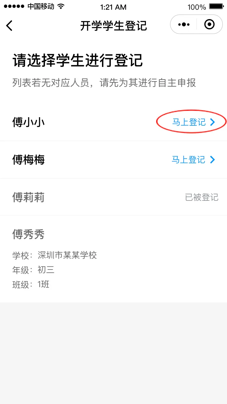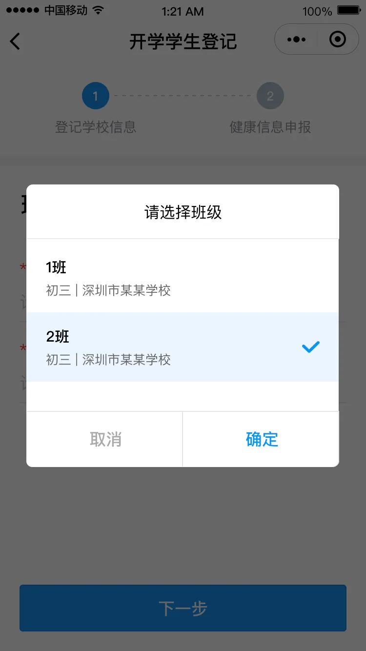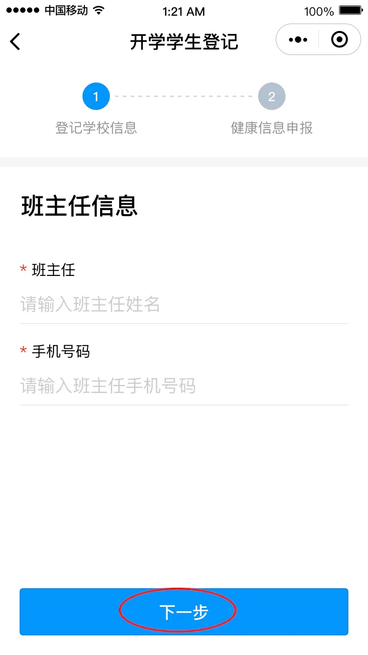 進入“開學學生登記”頁面,點擊“馬上登記”進入登記界面,填寫班主任姓名和手機號碼后點擊“下一步”,請選擇對應的班級,進入健康申報卡界面。