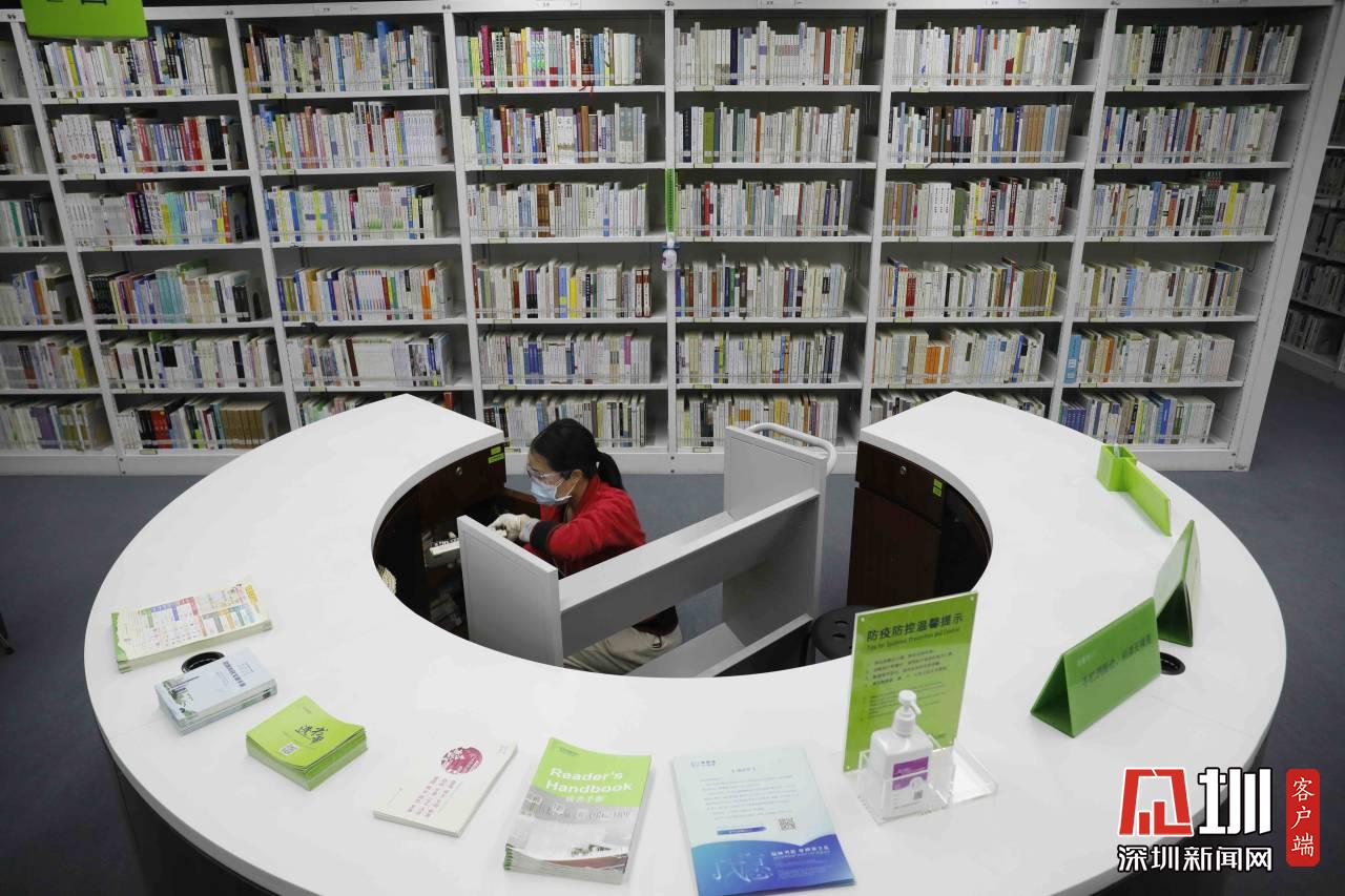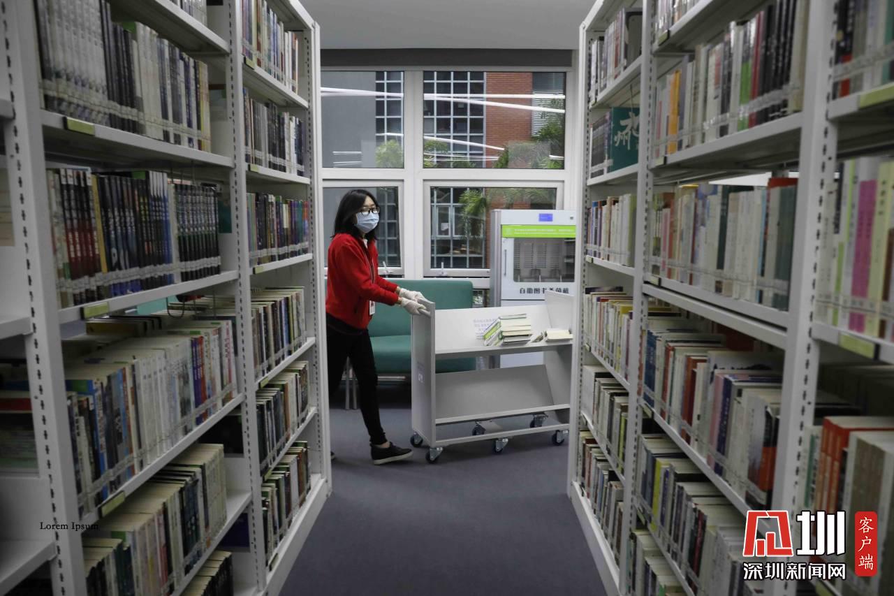 工作人員正在對福田圖書館的書做消毒處理。