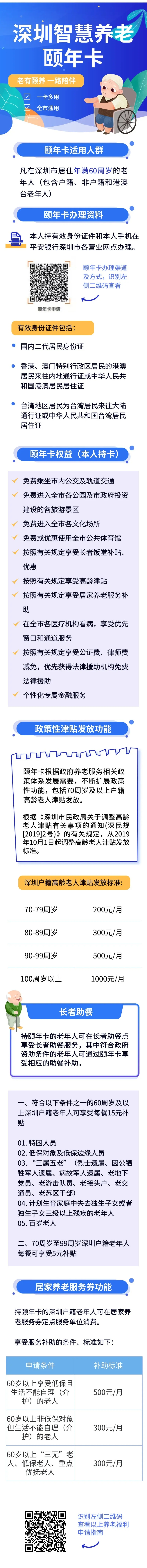 據悉,凡在深圳市居住年滿60周歲以上的老年人(包含港澳臺老年人),均可持有效身份證件和手機申請辦理?!邦U年卡”持卡人,可享受敬老優(yōu)待,包括免費進入全市各公園,免費進入市政府投資建設各旅游景區(qū),免費乘坐市內公交車和軌道交通。70周歲及以上戶籍老人還可享受高齡津貼發(fā)放;符合規(guī)定的戶籍老年人可享受居家養(yǎng)老消費的優(yōu)惠和補貼,包括:生活照料、家政服務、康復護理服務、日托服務、心理咨詢等。