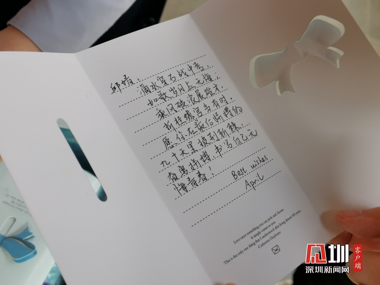 “滴水穿石戰(zhàn)中考,如歌歲月應(yīng)無悔。乘風(fēng)破浪展雄才,折桂蟾宮當(dāng)有時。愿你在最后拼搏的九十天里,披荊斬棘,奮勇拼搏,書寫自己無悔青春?!边@是龍華區(qū)外國語學(xué)校邱婧同學(xué)收到的老師親筆手寫的激勵卡,這些充滿力量的鼓舞詞句表達(dá)了畢業(yè)班園丁們對學(xué)生們的共同祝福與期盼。
