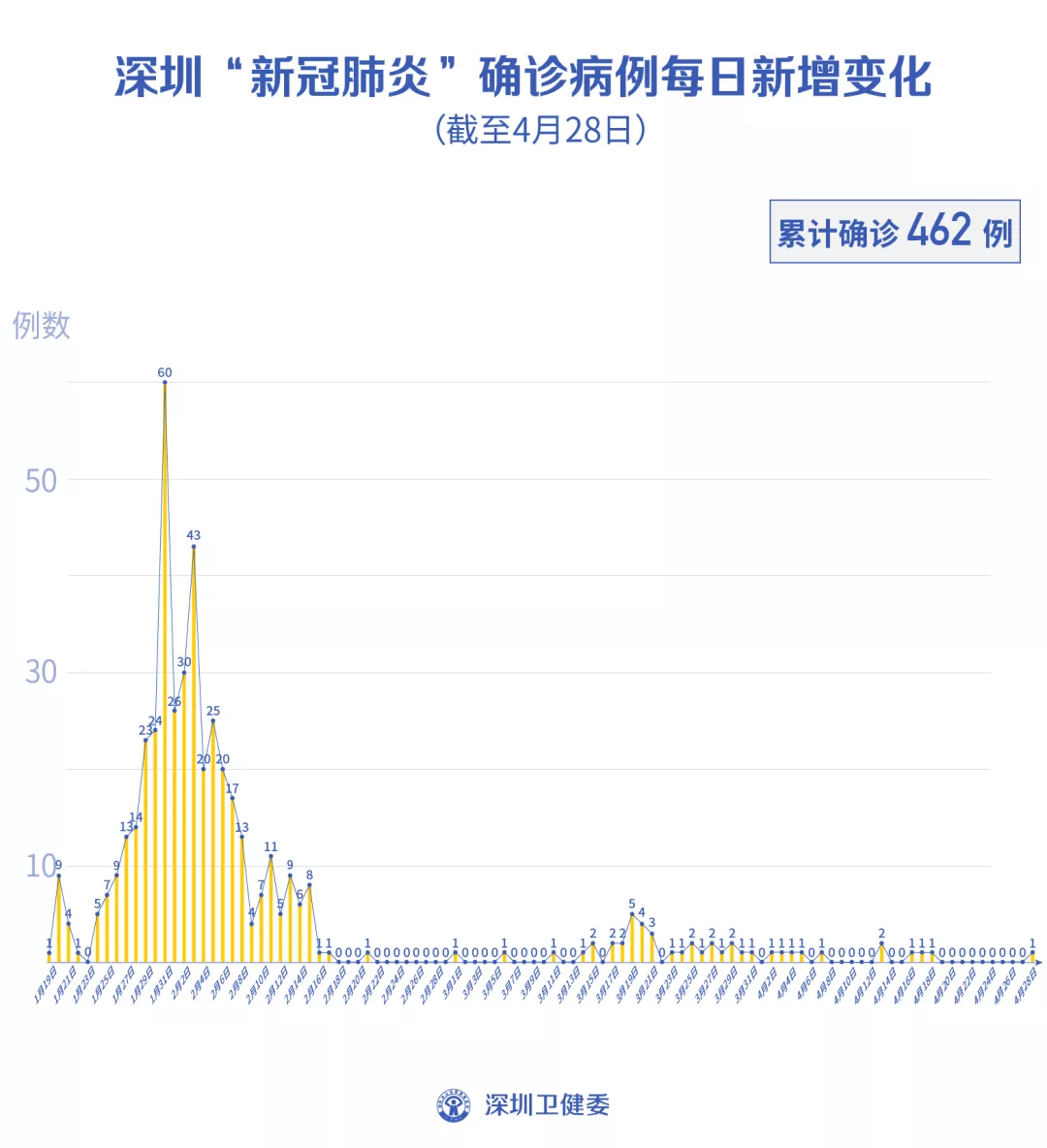 截至4月28日24時(shí),深圳累計(jì)報(bào)告新冠肺炎病例462例。4月28日當(dāng)天新增境內(nèi)病例1例,出院4例。