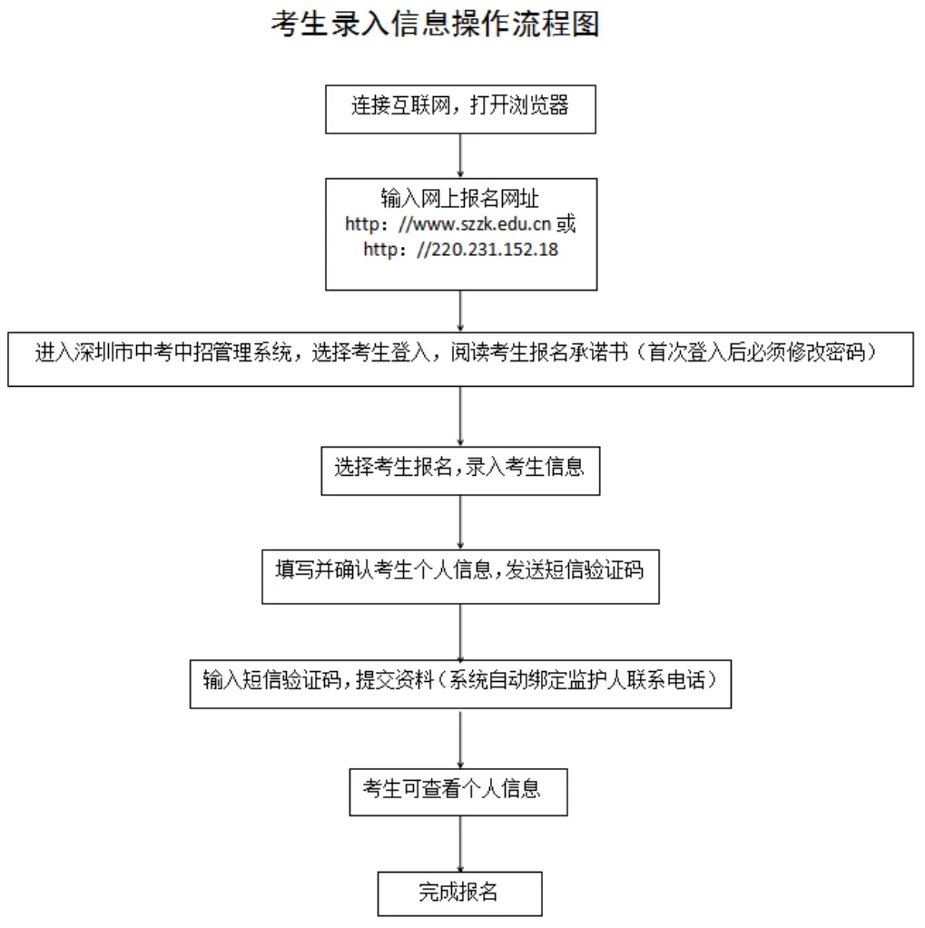 見(jiàn)圳客戶端·深圳新聞網(wǎng)2020年4月30日訊 據(jù)深圳市教育局消息,2020年深圳高中階段學(xué)校招生考試(以下簡(jiǎn)稱“中考”)報(bào)名定于5月6日-15日進(jìn)行,考試時(shí)間為7月20日-21日。 今年本市應(yīng)屆初中畢業(yè)生仍繼續(xù)在就讀學(xué)校集體辦理報(bào)名手續(xù)。符合深圳中考報(bào)名條件的深圳戶籍往屆生、在市外就讀的深圳戶籍應(yīng)屆初中畢業(yè)生(以下簡(jiǎn)稱“社會(huì)類考生”)采用網(wǎng)上報(bào)名方式進(jìn)行報(bào)名。 報(bào)名條件 一、具有我市戶籍的初中畢業(yè)生,可以在我市報(bào)名參加中考。 二、具有我市初三學(xué)籍的隨遷子女可以報(bào)名參加中考,同時(shí)符合以下條件的,可以參加相應(yīng)的公辦普高、民辦普高和中職學(xué)校的劃線錄取。 (一)父親或母親在我市具有合法穩(wěn)定職業(yè); (二)父親或母親在我市具有合法穩(wěn)定住所; (三)父親或母親持有有效《深圳經(jīng)濟(jì)特區(qū)居住證》; (四)父親或母親在我市繳納基本養(yǎng)老保險(xiǎn)及基本醫(yī)療保險(xiǎn),且至少其中一個(gè)險(xiǎn)種累計(jì)繳費(fèi)滿3年,社保累計(jì)年限計(jì)算截至2020年8月31日; (五)隨遷子女在我市具有3年完整初中學(xué)籍。 不符合上述條件但具有我市初中學(xué)籍的隨遷子女,可以在我市參加中考,但僅限于參加民辦普高補(bǔ)錄或中職學(xué)校注冊(cè)入學(xué)。 三、高中階段學(xué)校在校生不得報(bào)名。 本市應(yīng)屆初中畢業(yè)生報(bào)名辦法 本市應(yīng)屆初中畢業(yè)生于5月6日至7日在就讀學(xué)校集體辦理報(bào)名手續(xù)。 今年中考繼續(xù)實(shí)行網(wǎng)上報(bào)名。要求各學(xué)校開(kāi)放計(jì)算機(jī)房,為本??忌暇W(wǎng)報(bào)名提供方便。 5月8日至15日,學(xué)校組織考生進(jìn)行電子攝像,學(xué)校和考生分別上網(wǎng)錄入報(bào)名信息,考生錄入信息可參考“考生錄入信息流程圖”進(jìn)行操作。 市教育局強(qiáng)調(diào),學(xué)校不得以任何理由拒絕有本校學(xué)籍的應(yīng)屆畢業(yè)生報(bào)考(參加中職學(xué)校自主招生、注冊(cè)入學(xué)的考生,也須報(bào)名參加中考)。如有違反者,將嚴(yán)肅查處,并追究相關(guān)人員責(zé)任。同時(shí)要求各區(qū)有關(guān)職能部門(mén)、各有關(guān)學(xué)校(報(bào)名點(diǎn))要嚴(yán)格審查報(bào)名材料。對(duì)不符合報(bào)名條件、弄虛作假而被錄取的考生,一經(jīng)發(fā)現(xiàn),取消其錄取資格;已經(jīng)到錄取學(xué)校報(bào)到注冊(cè)的,取消其學(xué)籍,并追究相關(guān)人員責(zé)任。 社會(huì)類考生報(bào)名辦法 社會(huì)類考生采用網(wǎng)上報(bào)名方式進(jìn)行報(bào)名。報(bào)名考生需在5月6日至15日登錄報(bào)名網(wǎng)址(http://www.szzk.edu.cn/),按照提示進(jìn)行網(wǎng)上注冊(cè),上傳報(bào)名審核資料,由考生戶籍所在區(qū)社會(huì)報(bào)名點(diǎn)進(jìn)行線上審核,審核通過(guò)后系統(tǒng)將生成中考考生號(hào)及初始密碼,考生需用獲取的考號(hào)及密碼登錄中考中招管理系統(tǒng),填寫(xiě)個(gè)人信息,具體操作可參考“考生錄入信息流程圖”。同時(shí)需在報(bào)名截止前根據(jù)指引完成網(wǎng)上繳費(fèi)。 若考生網(wǎng)上報(bào)名審核不通過(guò),需按照系統(tǒng)的不通過(guò)原因提示,重新補(bǔ)充審核資料,如多次上傳資料失敗或?qū)徍瞬煌ㄟ^(guò),考生可撥打戶籍所在區(qū)的社會(huì)報(bào)名點(diǎn)電話進(jìn)行咨詢或電話預(yù)約,按照工作人員指示進(jìn)行操作報(bào)名,不要在未預(yù)約的情況下前往社會(huì)報(bào)名點(diǎn),盡量避免出行,減少人員聚集。 社會(huì)類考生操作流程如下圖: 考生錄入信息操作流程如下圖: 中考社會(huì)報(bào)名點(diǎn)一覽表 深圳各類考生具體報(bào)考范圍、各類升學(xué)資格申報(bào)所需條件和材料以及相關(guān)報(bào)名要求,考生可通過(guò)深圳市招生考試辦公室官網(wǎng)(zkb.sz.gov.cn)及官方微信公眾號(hào)(深圳市招生考試辦公室)查閱,市招考辦也將第一時(shí)間通過(guò)上述渠道發(fā)布各類中考資訊。