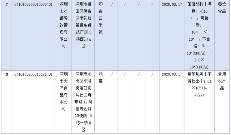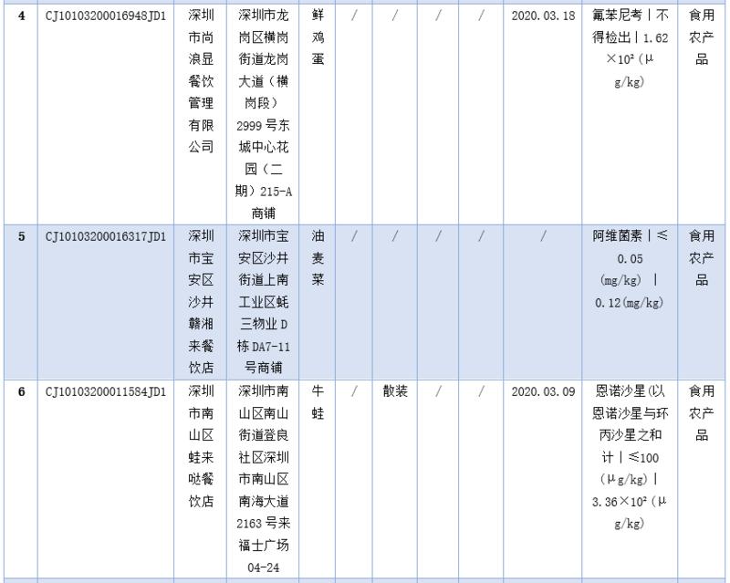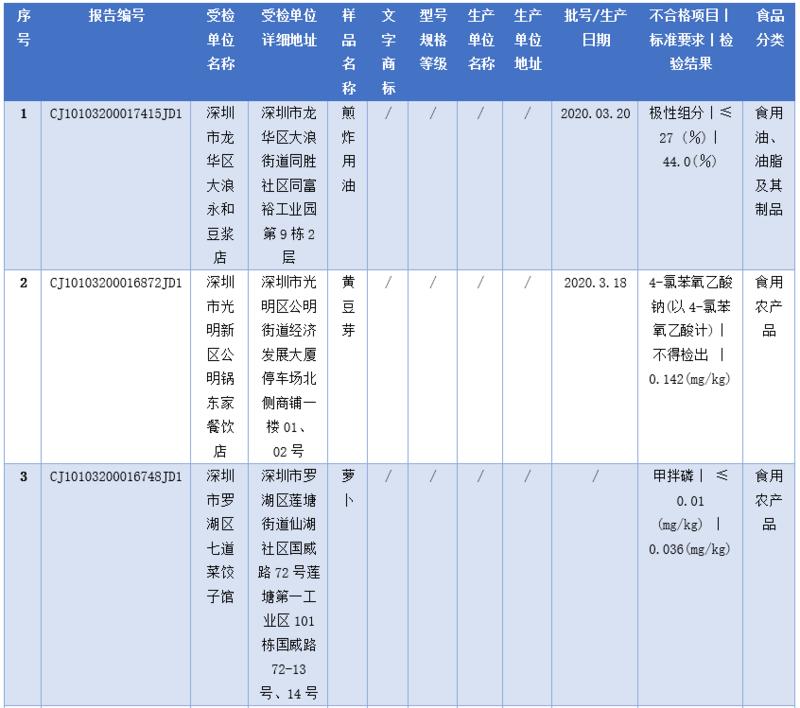 見圳客戶端·深圳新聞網(wǎng)2020年5月1日訊(深圳特區(qū)報(bào)記者 楊德琦)4月30日,深圳市市場(chǎng)監(jiān)督管理局發(fā)布第十四期食品安全抽樣檢驗(yàn)情況通報(bào),3月共抽檢餐飲環(huán)節(jié)食品1009批次,涉及餐飲環(huán)節(jié)經(jīng)營(yíng)主體919家次,共檢測(cè)食品指標(biāo)6347項(xiàng)次。其中不合格樣品8批次,涉及不合格食品類別有食用農(nóng)產(chǎn)品6批次,黃豆芽、蘿卜、雞蛋、油麥菜、牛蛙等在列;餐飲食品1批次,為即食白米飯;食用油、油脂及其制品1批次,為煎炸用油。涉及不合格項(xiàng)目類別為獸藥殘留、農(nóng)藥殘留、非食用物質(zhì)、微生物污染、品質(zhì)指標(biāo)。