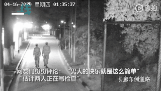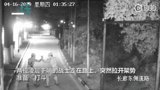 兩位凌晨下哨的戰(zhàn)士走在路上,突然間拉開(kāi)架勢(shì),準(zhǔn)備“打斗”。劍拔弩張之際,突然畫(huà)風(fēng)一轉(zhuǎn),兩人做起了互相加油打氣的動(dòng)作。
