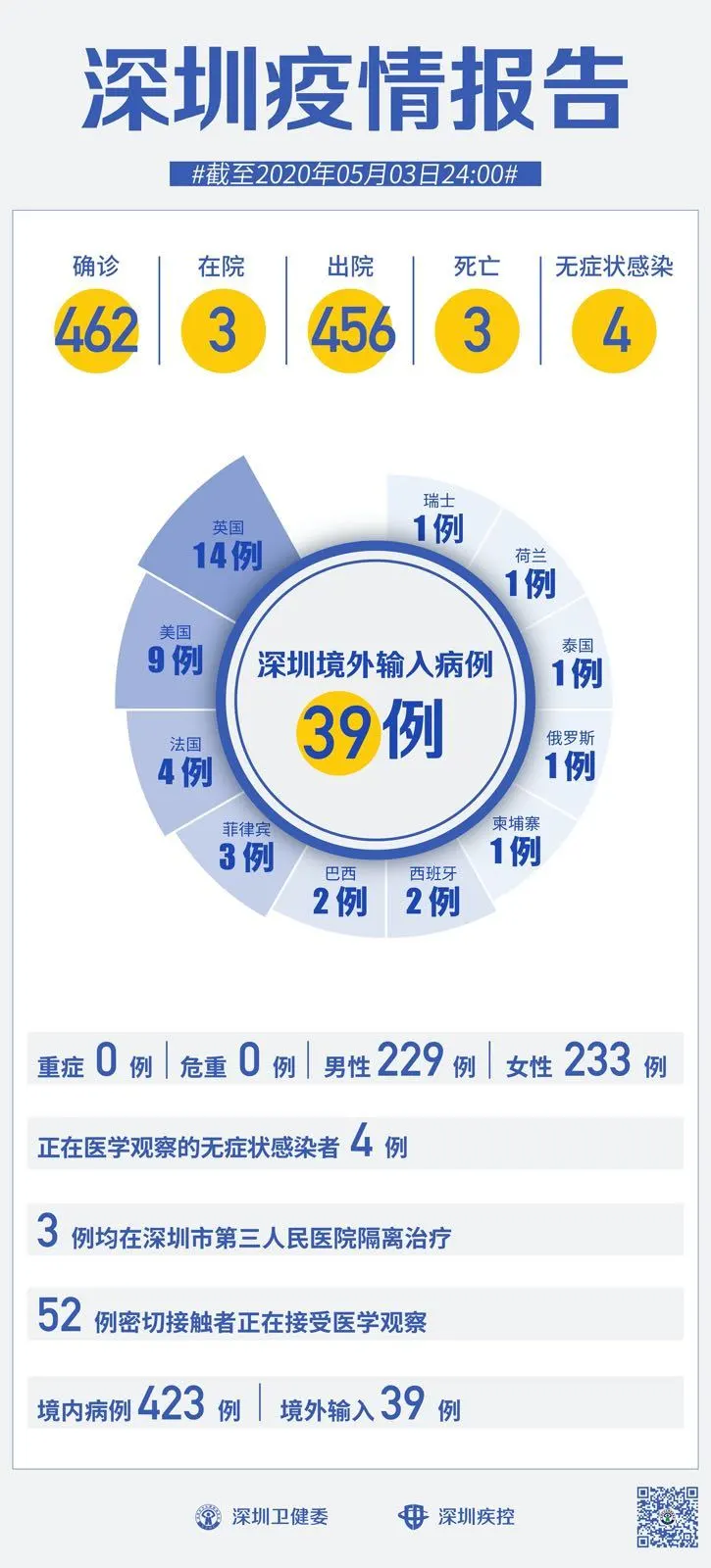 截至5月3日24時,深圳累計報告新冠肺炎病例462例。5月3日當天新增出院1例。