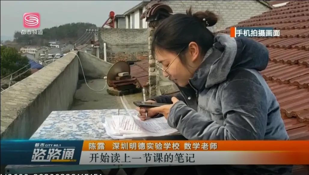 深圳中小學(xué)網(wǎng)課開課以來,廣大青年教師克服種種不利條件,變身教育主播,讓知識穿越屏幕直達(dá)學(xué)生心靈,深圳明德實驗學(xué)校的陳露老師就是其中一位典型代表。她因疫情滯留于湖北農(nóng)村,由于信號差,一開始為了錄制微課,白天她就帶好口罩跑到雜草叢生的山頂找信號,一塊木頭當(dāng)?shù)首?,坐下慢慢等上傳視頻,頂著寒風(fēng)一坐就是半天。線上教學(xué)正式開課后,由于設(shè)備和信號問題,陳老師只能采用QQ直播的方式給學(xué)生上課,為了保障語音效果,她把課堂搬到信號稍強(qiáng)的屋頂。上屋頂不是件容易的事,陳老師必須先爬一個陡峭的梯子,再匍匐穿過一個孔洞才能到達(dá)。一個天臺、一張折疊桌成了她的“三尺講臺”,一疊信紙成了她的“黑板”,一部手機(jī)成了她的“多媒體”。陳露老師每天坐在樓頂?shù)暮焙惋L(fēng)雪中,堅持完成直播課,保證學(xué)生正常的線上學(xué)習(xí)。