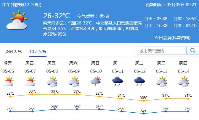 見(jiàn)圳客戶端·深圳新聞網(wǎng)2020年5月5日訊 深圳市氣象臺(tái)預(yù)計(jì),5日我市晴天間多云,氣溫25℃-32℃,中北部和人口密集區(qū)最高氣溫34℃-35℃;6-9日多云間晴天,天氣炎熱,午后局地有熱雷雨;10-11日受冷空氣影響,有雷陣雨。