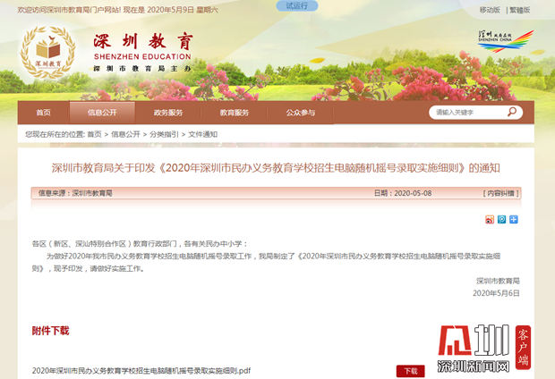 5月8日,深圳市教育局印發(fā)《2020年深圳市民辦義務教育學校招生電腦隨機搖號錄取實施細則》(以下簡稱《細則》),《細則》中要求報名人數(shù)超過區(qū)教育行政部門核定的招生人數(shù)的民辦義務教育學校,全部實行電腦隨機搖號錄取學生。參加民辦義務教育學校電腦隨機搖號錄取的學生,須符合深圳市招生文件規(guī)定的入學條件。
