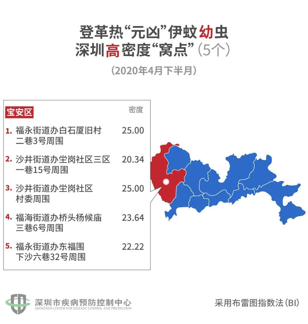 據(jù)悉,在全市設置的423個監(jiān)測點中,不合格的有104個,占24.59%。其中低密度有79個,中密度有20個,高密度有5個。5個“蚊子窩”全在寶安!