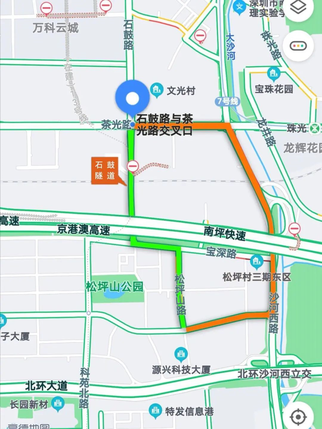▲西麗往科技園北區(qū)此前需繞行沙河西路(黃色途徑),現(xiàn)經(jīng)石鼓隧道可快速到達(綠色途徑)。