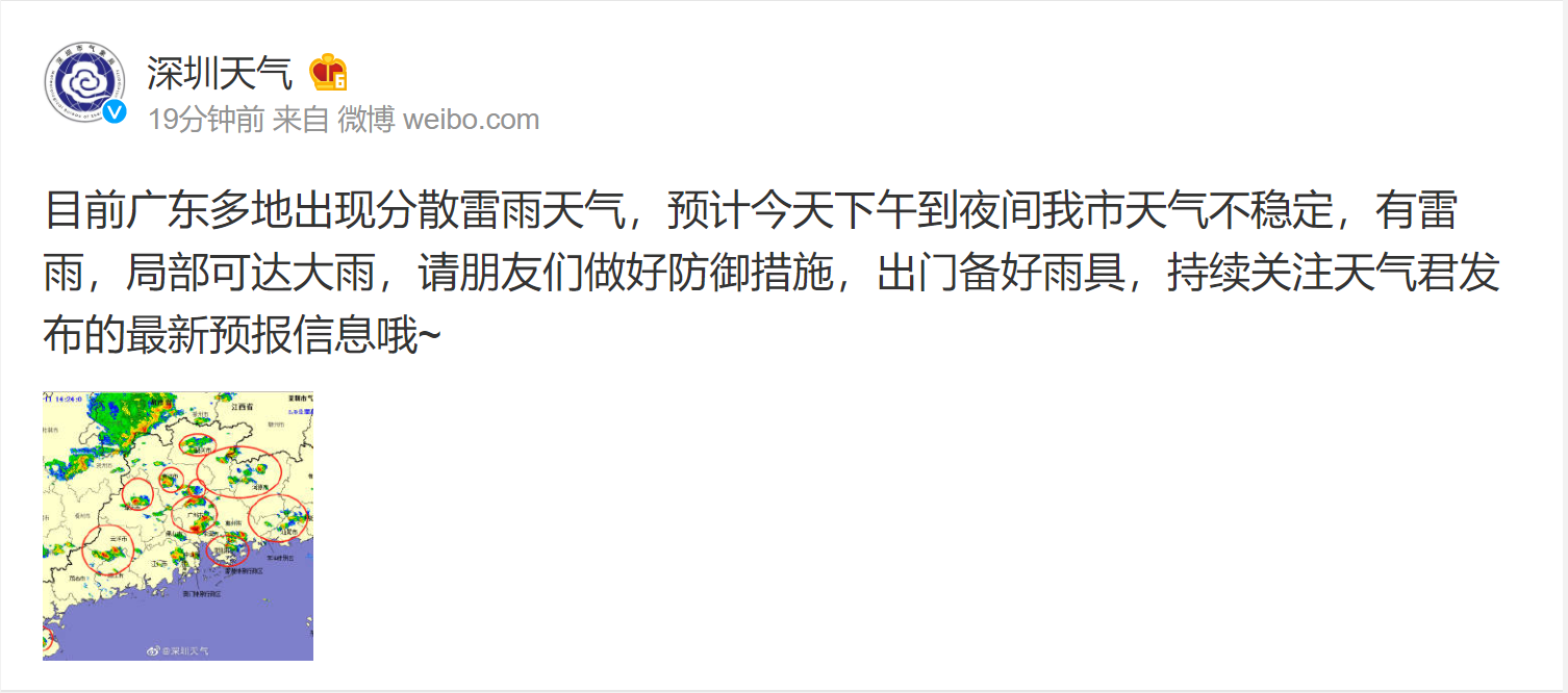 據(jù)@深圳天氣消息,目前廣東多地出現(xiàn)分散雷雨天氣,預(yù)計今天下午到夜間深圳天氣不穩(wěn)定,有雷雨,局部可達(dá)大雨,請大家做好防御措施,出門備好雨具,持續(xù)關(guān)注深圳天氣發(fā)布的最新預(yù)報信息。