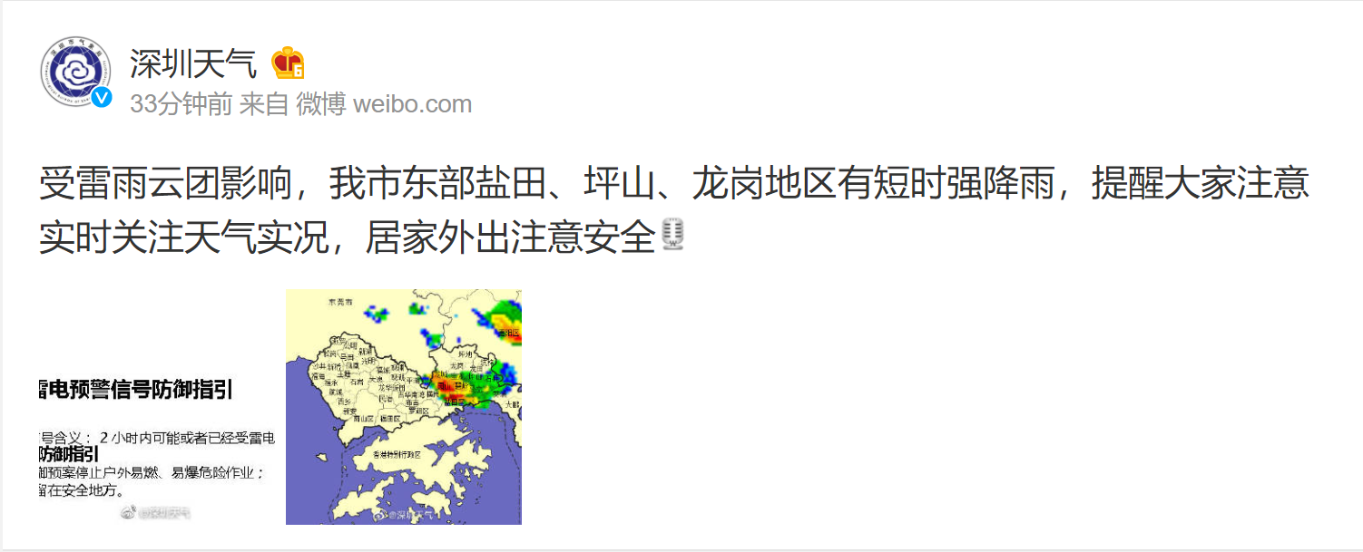 目前,受雷雨云團(tuán)影響,深圳東部鹽田、坪山、龍崗地區(qū)有短時強(qiáng)降雨。