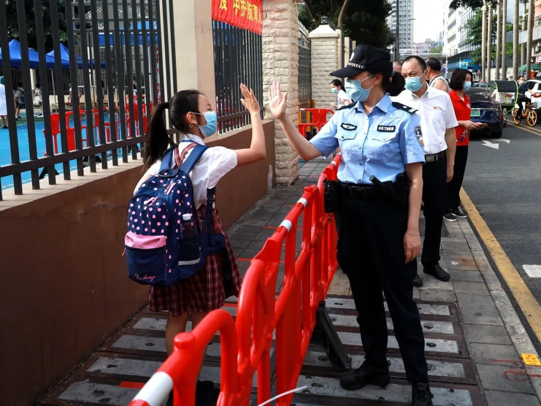 石廈小學(xué)門口,福保派出所民警守在校門口的“安全通道”,和有序進(jìn)校門的學(xué)生們打招呼,一名女學(xué)生特地和民警擊掌,口罩也擋不住她的快樂神情。民警表示:“有我們在,必定守護(hù)好學(xué)生的安全?!?/p>