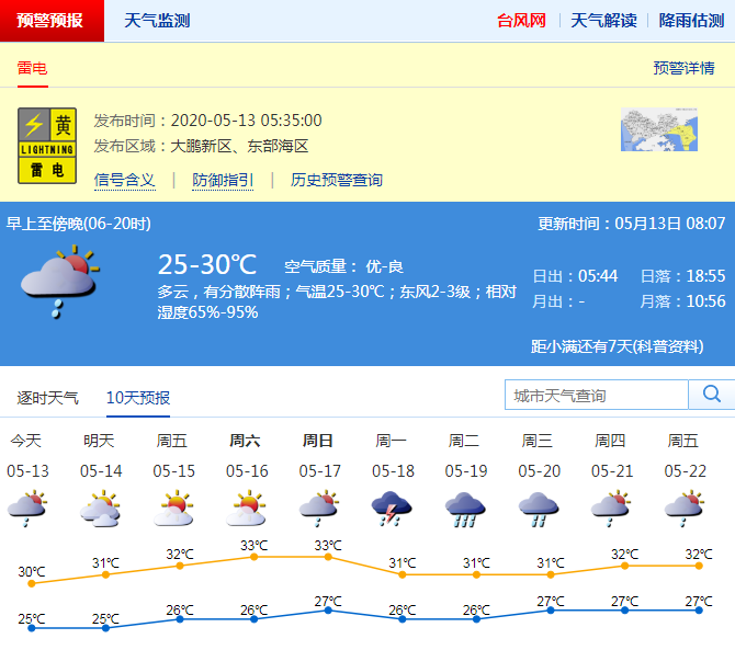 預(yù)計(jì)13日多云間陰天,氣溫24-29℃;14-17日多云到晴天,局部偶有短時陣雨或雷陣雨,最高氣溫可達(dá)32-33℃,天氣漸趨悶熱;展望18-19日有一次明顯降雨過程。