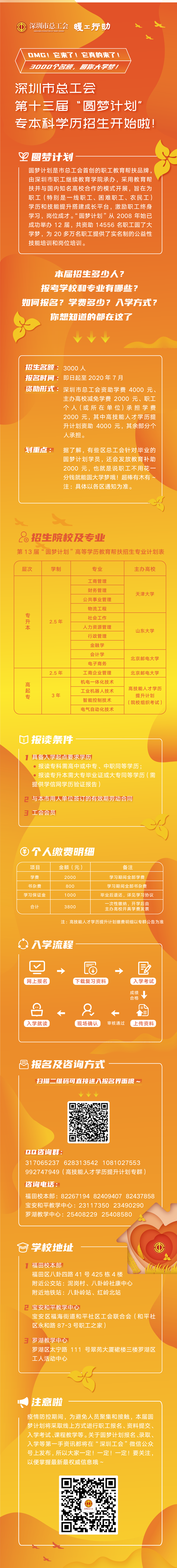 在疫情防控、復工復產(chǎn)的特殊形勢下,結(jié)合市總工會“暖工行動”相關(guān)要求,本屆“圓夢計劃”進一步提高幫扶精準性,向受疫情影響嚴重的企業(yè)和職工傾斜,推動企業(yè)和職工共擔責任、共克時艱,穩(wěn)定職工隊伍和就業(yè),努力做到職工多轉(zhuǎn)崗、少下崗、多就業(yè)、少失業(yè)。符合報名條件的職工可在“深圳工會”微信公眾號上進行報名,報名截止日期為7月30日,主辦方將根據(jù)報名人數(shù)分期分批組織入學考試。入學考試采用“文化素養(yǎng)+職業(yè)技能+工作實績”的多元評價方式,在“文化素養(yǎng)”為主體考試中增加工會基本知識,提高職工工會意識。所有錄取學員將于今年9月入學就讀,進行線上線下相結(jié)合的學習,在規(guī)定學制內(nèi)修滿學分將獲得各高校頒發(fā)、國家承認的畢業(yè)證書。