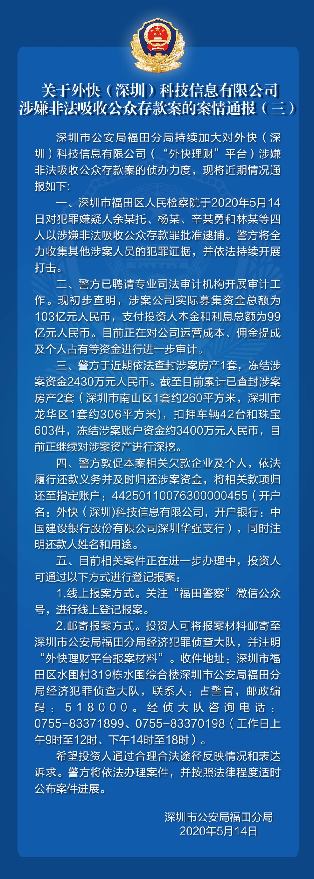 關(guān)于外快(深圳)科技信息有限公司涉嫌非法吸收公眾存款案的案情通報(三)