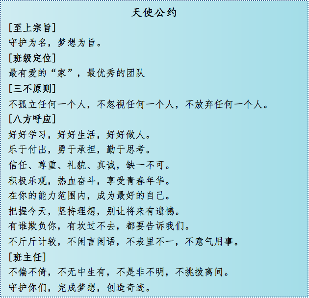 詹老師所帶班級嚴(yán)格遵守著“公約精神”,創(chuàng)造了一個個驚喜:2015級14班在藝術(shù)季班級文化設(shè)計中是全校唯一全員參與的班級;2016級8班在跳繩比賽中從練習(xí)時的倒數(shù)第一到復(fù)賽逆襲闖進(jìn)決賽獲得一等獎;2017級9班在疫情網(wǎng)課期間堅持每科作業(yè)“今日事今日畢”,無一人掉隊(duì)。
