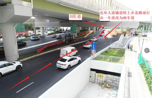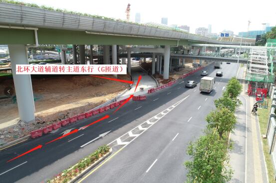 北環(huán)大道主道轉上步北路南行路口封閉作應急使用,為緩解輔路壓力,北環(huán)大道輔道轉上步北路南行由原一車道改為兩車道,新增的車道于5月18日同步開通。