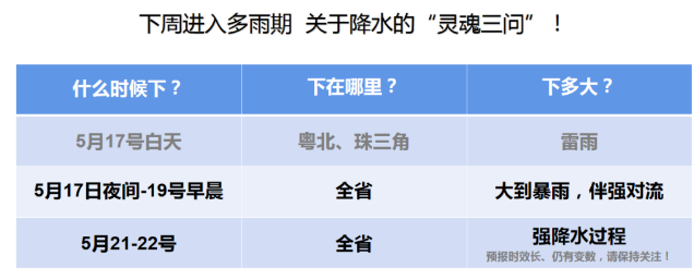 17日夜間到19日早晨,珠三角、粵東和陽江、茂名有大雨到暴雨,其余市縣有大雨局部暴雨;雷雨時(shí)伴有8級(jí)左右的短時(shí)大風(fēng)。