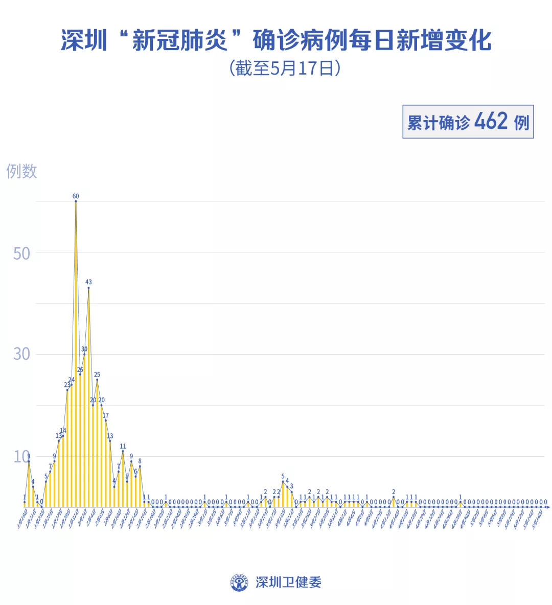 截至5月17日24時,深圳累計報告新冠肺炎病例462例。