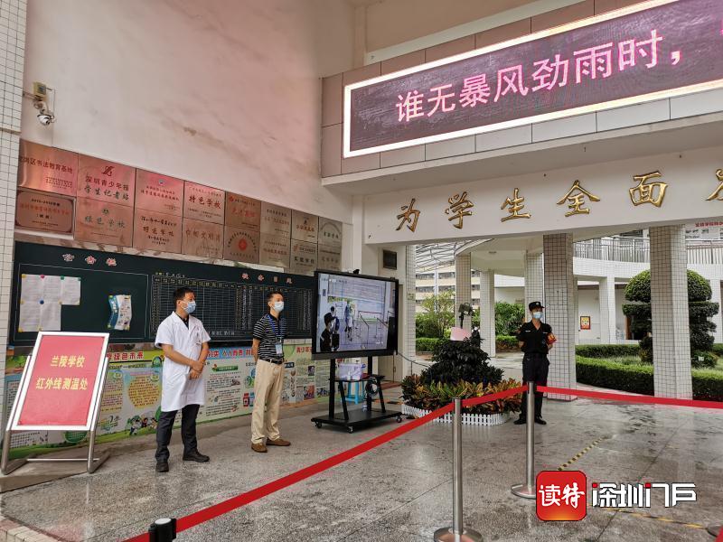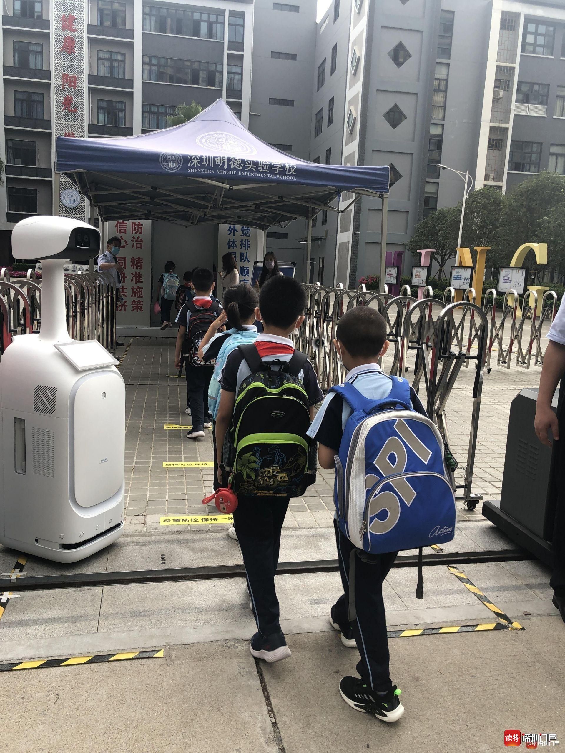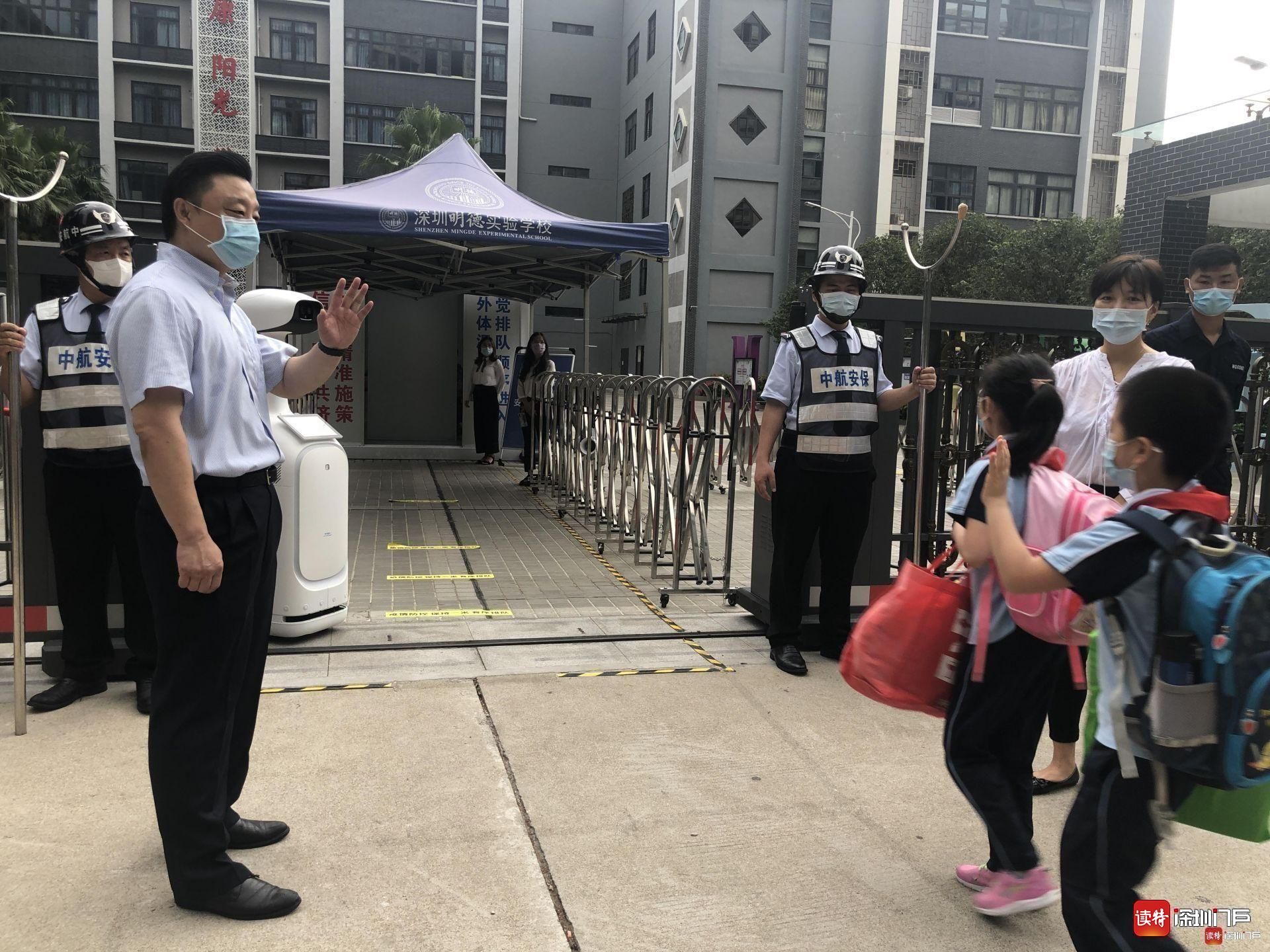 “同學(xué)們好!”“歡迎回來!”從7點(diǎn)起,明德實(shí)驗(yàn)學(xué)校校長魯江與工作人員就在香蜜校區(qū)校門口迎候?qū)W生們,提醒孩子們戴好口罩,也與家長們交流返校事宜。校門口的一臺超氧水消殺機(jī)器人也在積極投入工作,工作人員在后臺控制面板可以監(jiān)測到入校人員的體溫情況。