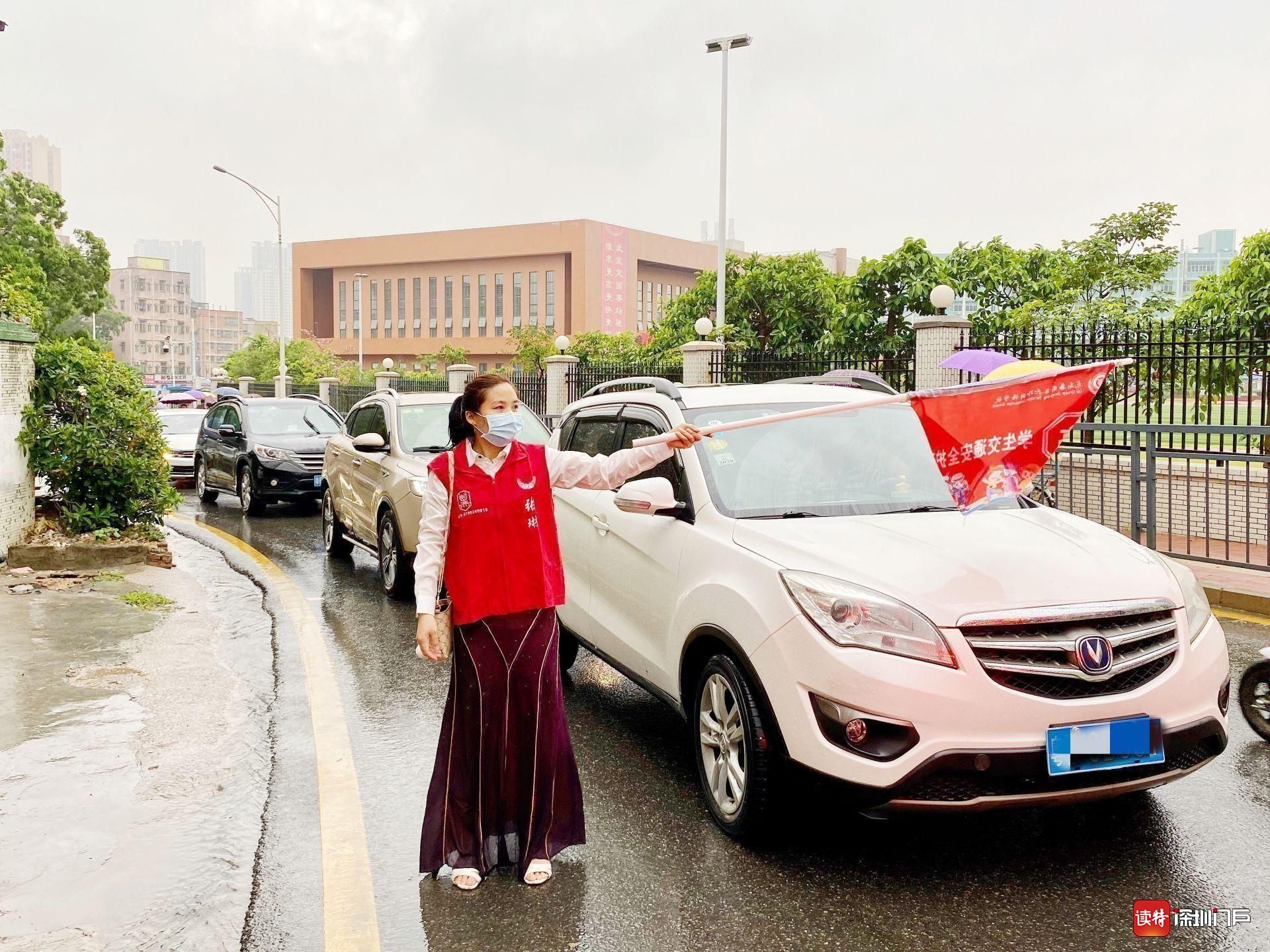 交警叔叔在路口指揮交通,穿著紅馬甲的老師和家長一路指引,校長伯伯早早在校門口等候,藍(lán)色帳篷走廊遮蔽了風(fēng)雨,“好多人在為我們服務(wù)啊……”