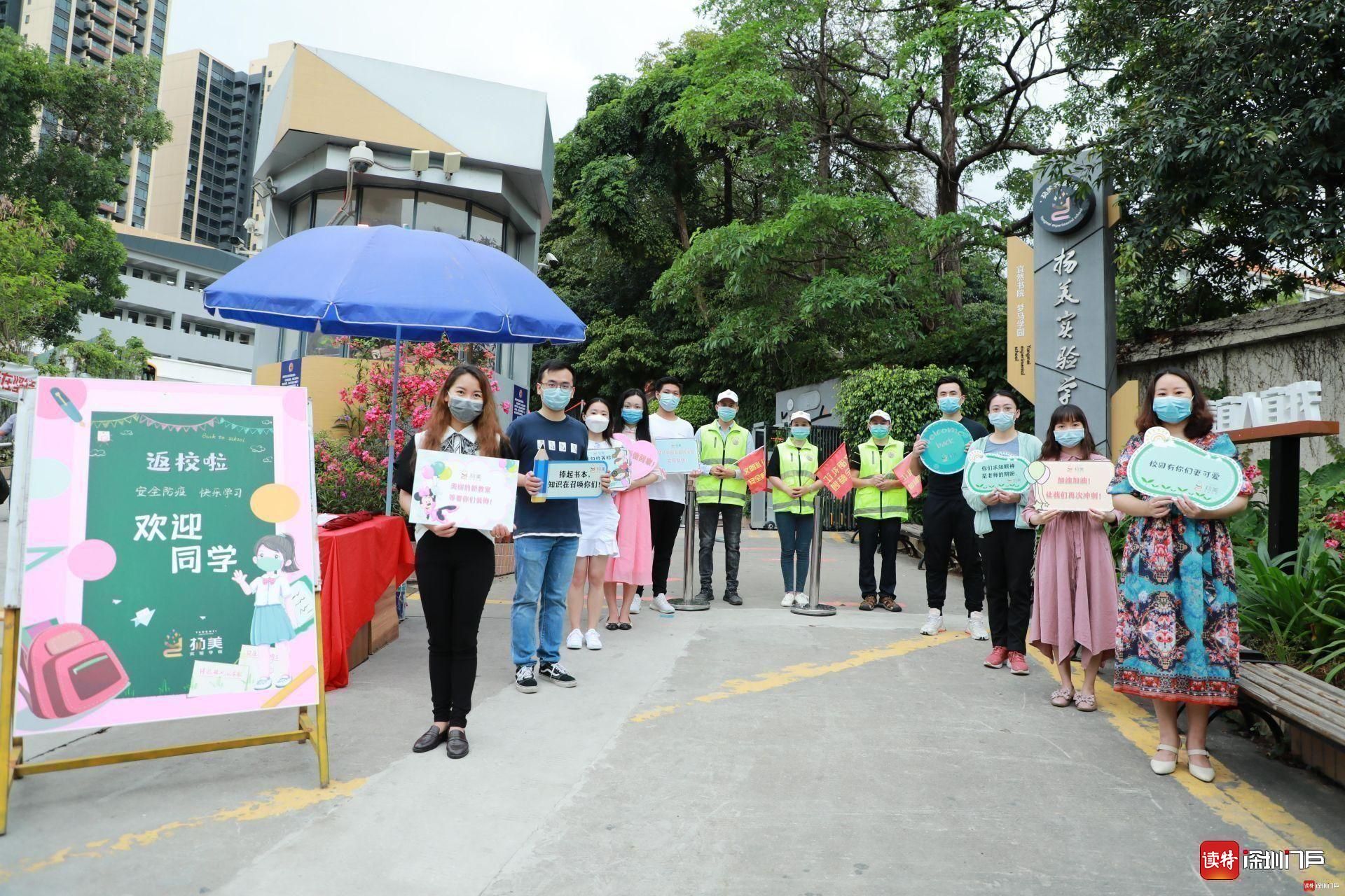 揚(yáng)美實(shí)驗(yàn)的老師們捧著特制歡迎牌,向返校的孩子們問好。家長義工們身穿綠馬甲、手持小紅旗,在校門附近疏通交通,為孩子們保駕護(hù)航。揚(yáng)美學(xué)子佩戴口罩,按照錯(cuò)峰時(shí)間表通過體溫測量儀,有序進(jìn)入校園。