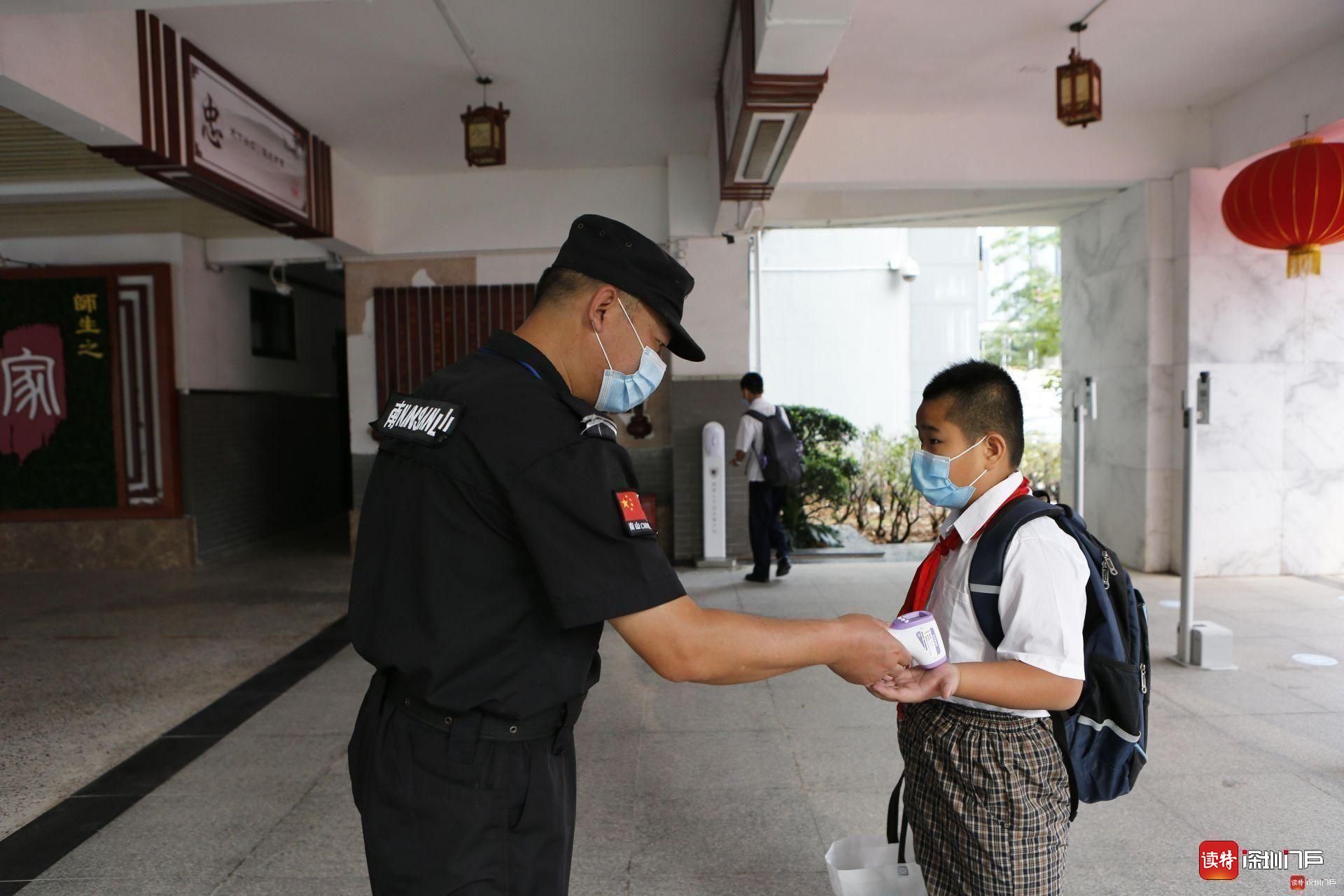 南山區(qū)科創(chuàng)學(xué)校,安保人員正在為返校的學(xué)生測量體溫。
