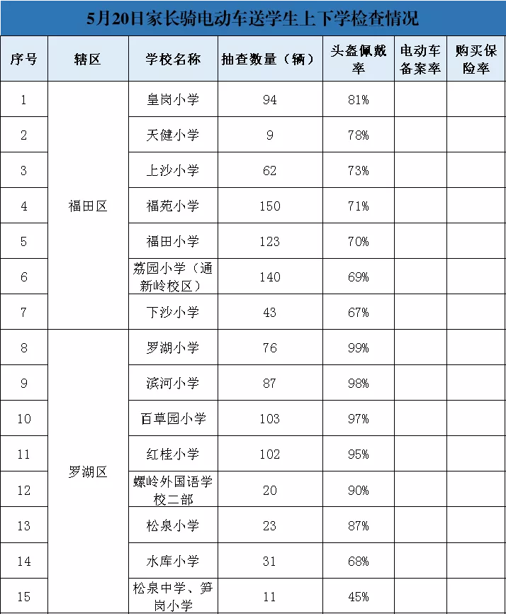 5月20日,深圳交警在全市范圍內(nèi)選取了70所學(xué)校進行抽查,共5037輛電動車被查,頭盔佩戴率達89%。其中松泉中學(xué)、筍崗小學(xué)、西麗學(xué)校、福華學(xué)校頭盔佩戴率不足一半。