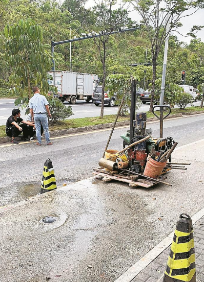 2020年5月1日,執(zhí)法支隊(duì)龍崗大隊(duì)執(zhí)法人員在轄區(qū)內(nèi)值班巡查時,接到投訴稱愛南路上海外國語學(xué)校門口有道路施工人員鉆探時鉆破水管,現(xiàn)場水流滿地,請求執(zhí)法人員前往調(diào)查。