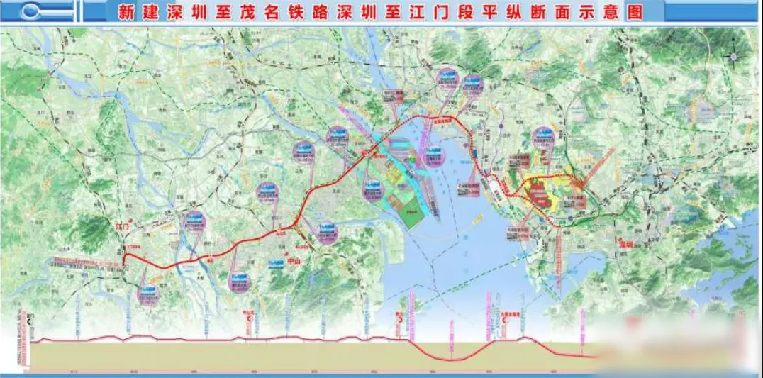 新建鐵路深圳至茂名鐵路深圳至江門(mén)段正線(xiàn)從深圳樞紐西麗站(規(guī)劃)引出,經(jīng)深圳市、東莞、南沙區(qū),中山、江門(mén),引入深茂鐵路江門(mén)至茂名段江門(mén)站(在建)。