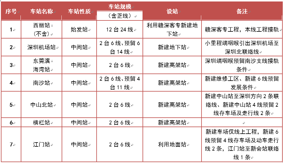 項(xiàng)目共設(shè)西麗(不含)、深圳機(jī)場(chǎng)、濱海灣、南沙、中山北、橫欄、江門(mén)等7個(gè)車(chē)站,其中西麗、深圳機(jī)場(chǎng)為地下站,濱海灣、南沙、中山北、橫欄為高架站,江門(mén)站為地面站。