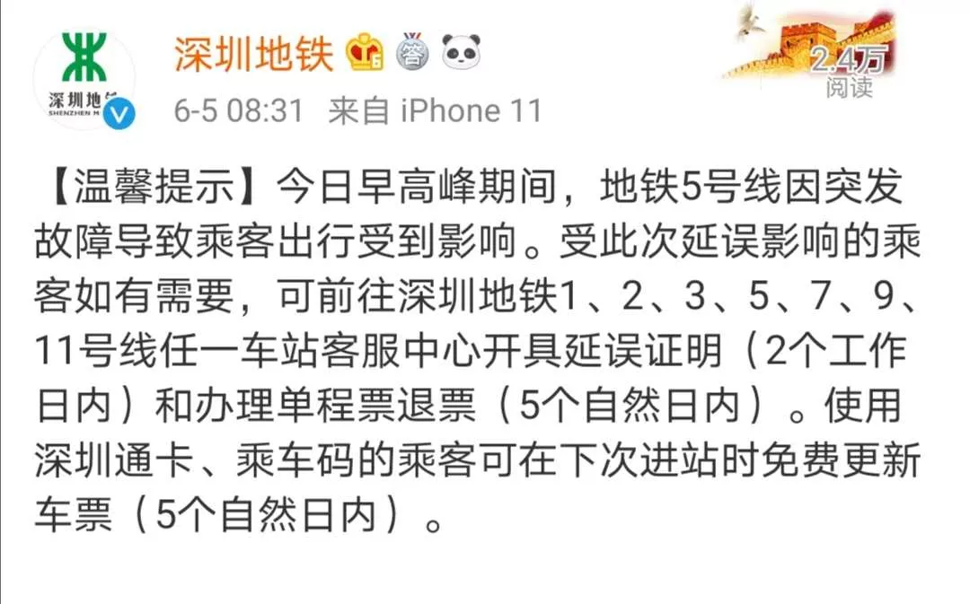 隨后,深圳地鐵官方微博發(fā)布溫馨提示,今日(6月5日)早高峰期間,地鐵5號線因突發(fā)故障導(dǎo)致乘客出行受到影響。受此次延誤影響的乘客如有需要,可前往深圳地鐵1、2、3、5、7、9、11號線任一車站客服中心開具延誤證明(2個工作日內(nèi))和辦理單程票退票(5個自然日內(nèi))。使用深圳通卡、乘車碼的乘客可在下次進(jìn)站時免費更新車票(5個自然日內(nèi))。