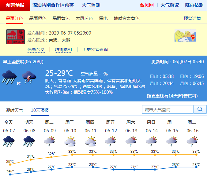 【06-07 05:25 】過去2小時(shí),南澳、大鵬街道累計(jì)雨量已達(dá)大暴雨,預(yù)計(jì)強(qiáng)降雨還將持續(xù)1-2小時(shí),深圳市氣象臺(tái)在南澳、大鵬街道發(fā)布暴雨紅色分區(qū)、大風(fēng)藍(lán)色分區(qū)、雷電預(yù)警,全市進(jìn)入暴雨緊急防御狀態(tài),請(qǐng)迅速做好防御工作。用人單位視情況安排工作人員推遲上班、提前下班或者停工。