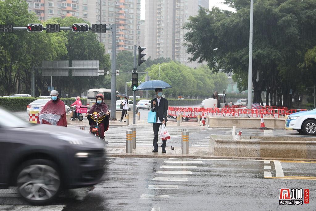 雨中等待紅綠燈的深圳市民。